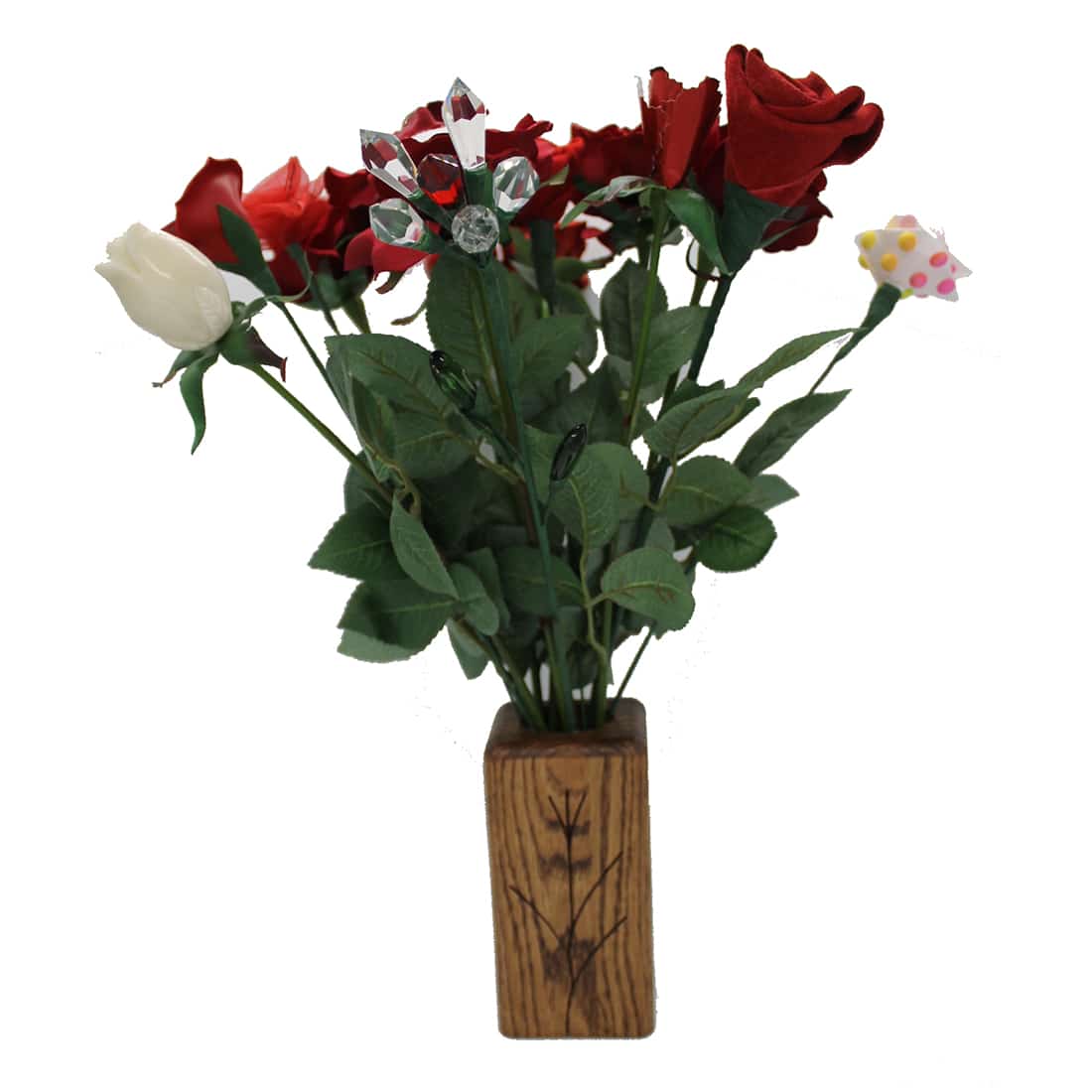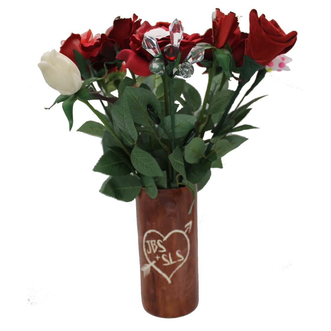 We have a variety of stem options including 15-stem (15 for 15th),12-stem, 6-stem, 2-stem, and 1-stem. We also have a “1-stem for each year” option, which would include 1 rose representing each year of marriage: crystal, “ivory”, lace, silk, steel, aluminum, pottery, bronze, wool, candy, wood, fruit, leather, cotton, and paper. The idea here is that you would add a stem each year to a growing display.