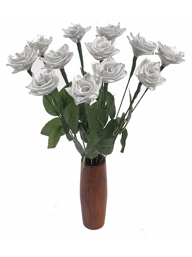The traditional 25th year anniversary gift is made from silver! Our JustSilverRibbonRoses are handmade from silver ribbon and formed into a flower that sits atop a 17” stem with a beautiful artificial leaf in the middle.
