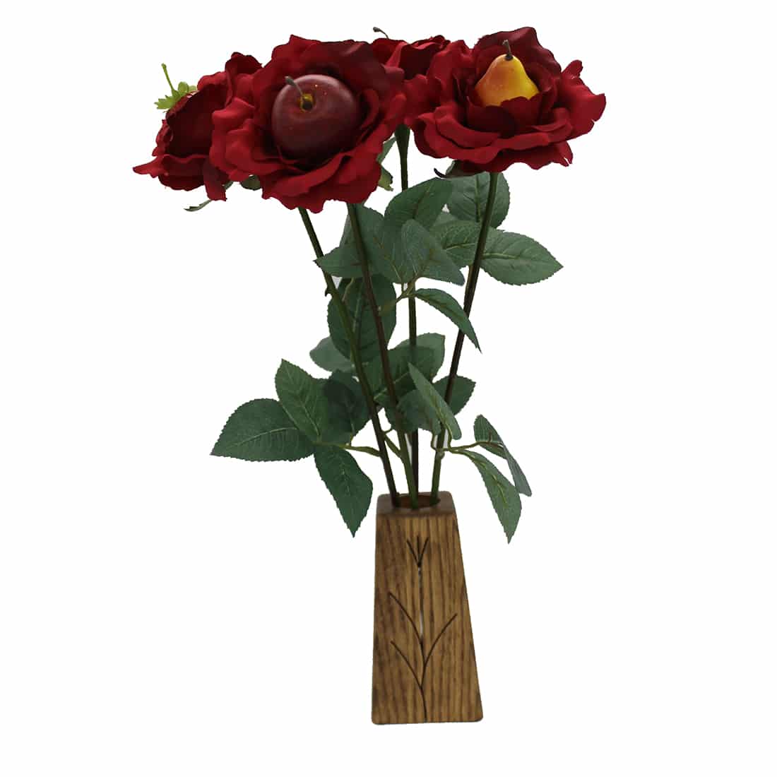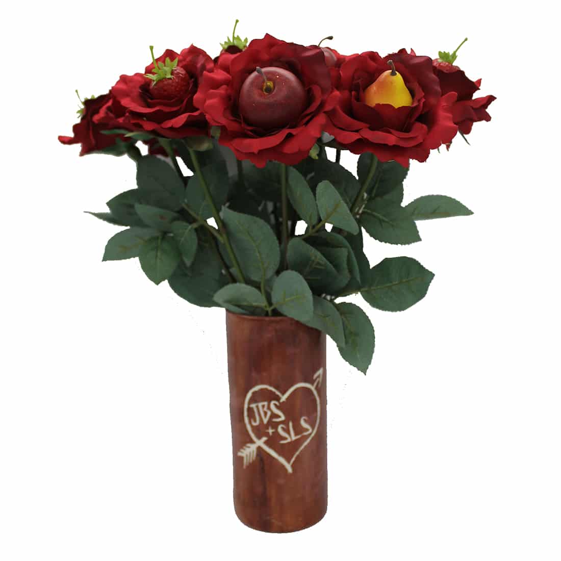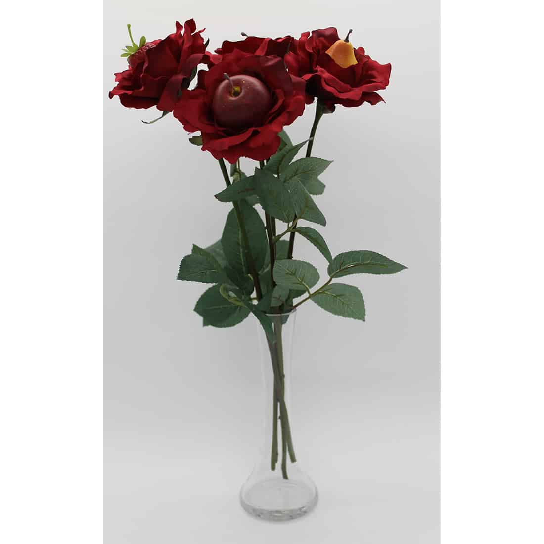 The traditional 4th anniversary gift is fruit. JustFruitRoses are created with our finest artificial roses and an artificial fruit glued in the center.