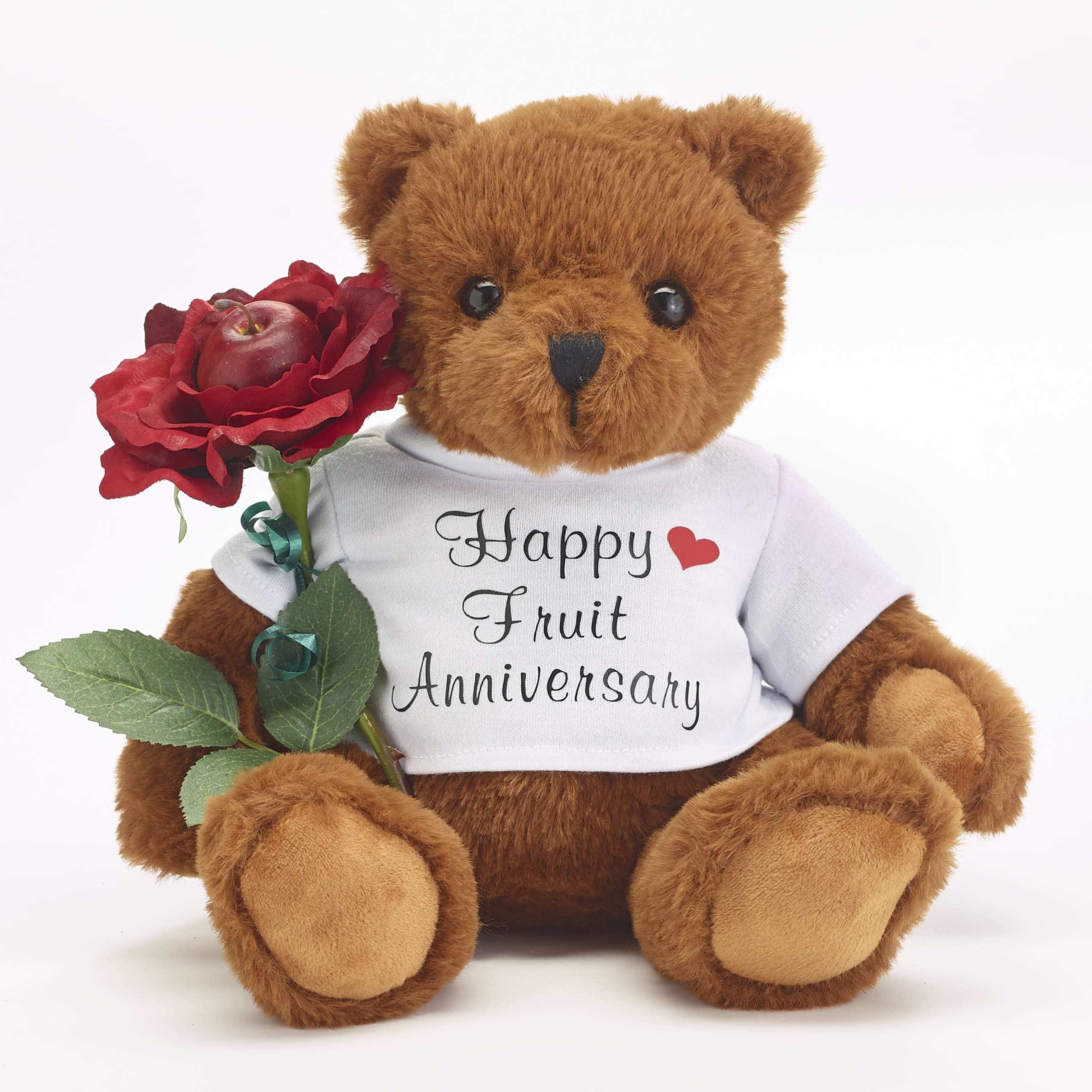 The 4th Wedding Anniversary is the “fruit” Anniversary. What could be cuter than our 10″ Teddy Bear wearing a t-shirt that says “Happy Fruit Anniversary” while holding a JustFruitRose?