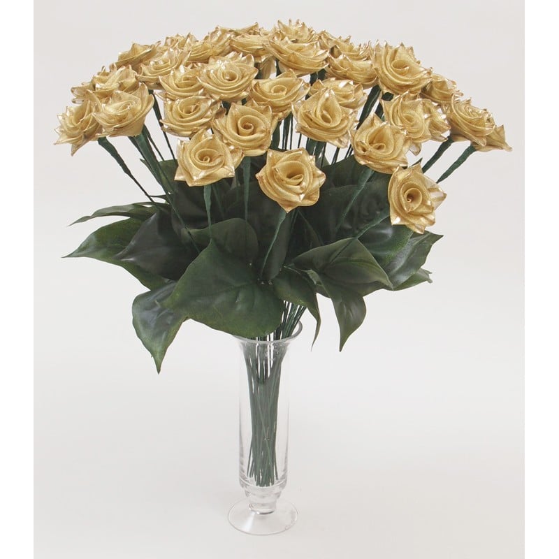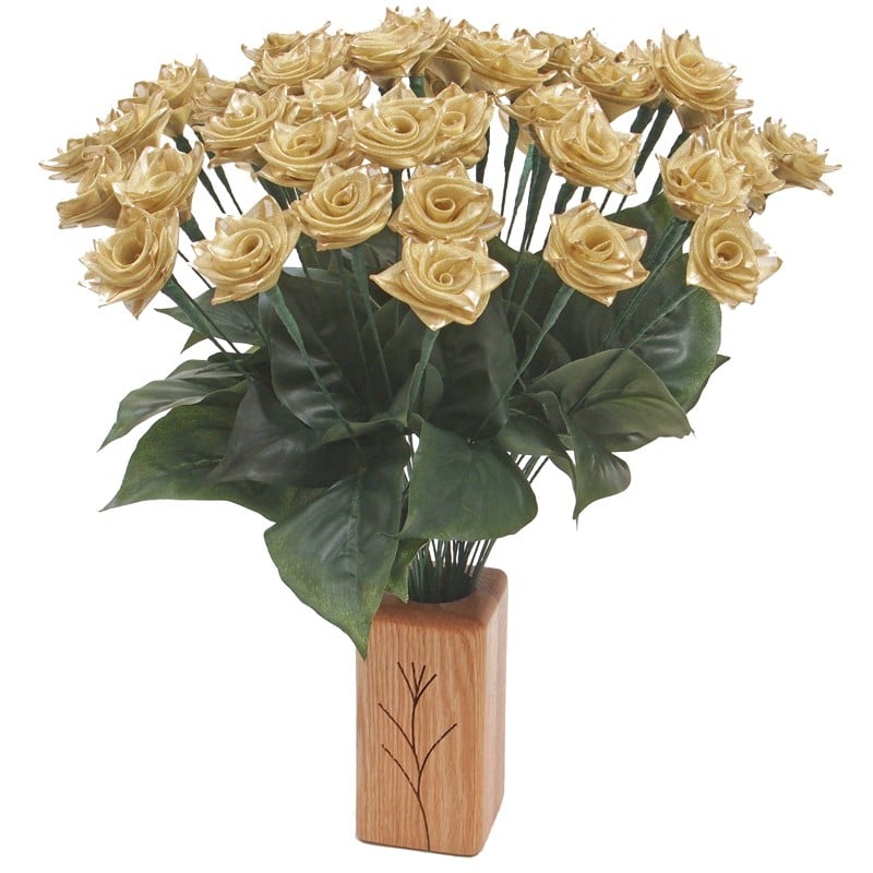 The traditional gift for a 50th Wedding Anniversary is made from gold! Our JustGoldRibbonRoses are handmade from gold ribbon and formed into a flower that sits atop a 17” stem with a beautiful artificial leaf in the middle.