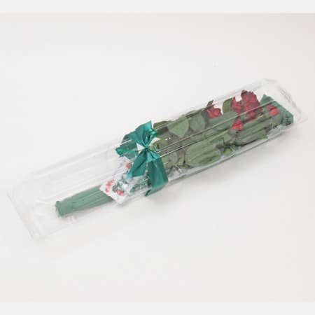 We package all our bouquets in clear, long-stem rose boxes with tissue, ribbons, & glitter for a great out-of-the-box gift presentation.