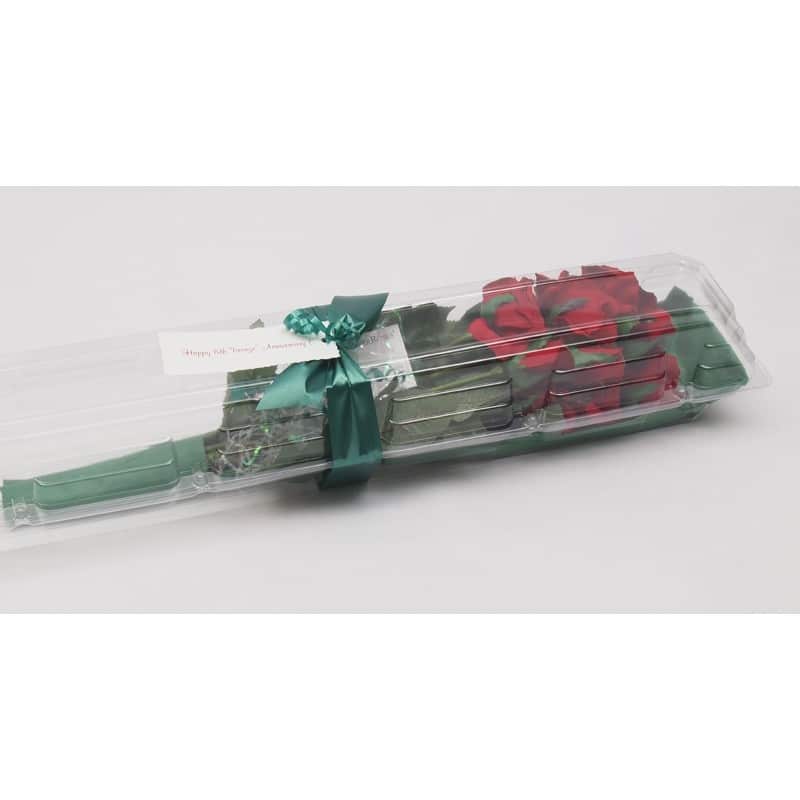 We package all our bouquets in clear, long-stem rose boxes with tissue, ribbons, & glitter for a great out-of-the-box gift presentation.