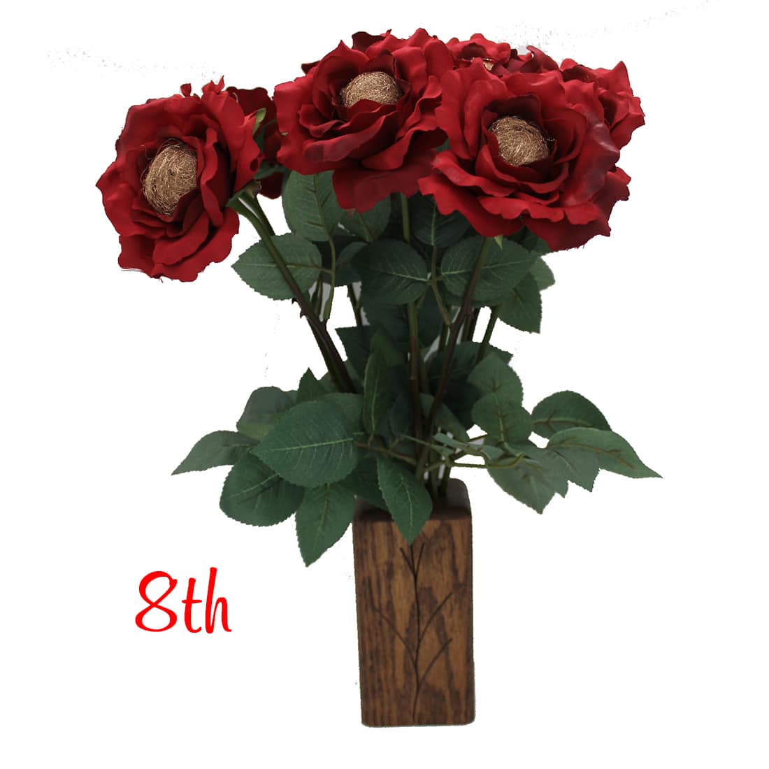We have a variety of stem options including 12-stem, 8-stem (8 for 8th), 2-stem, and 1-stem. We also have a “1-stem for each year” option, which would include 1 rose representing each year of marriage: bronze, wool, candy, wood, fruit, leather, cotton, and paper. The idea here is that you would add a stem each year to a growing display.
