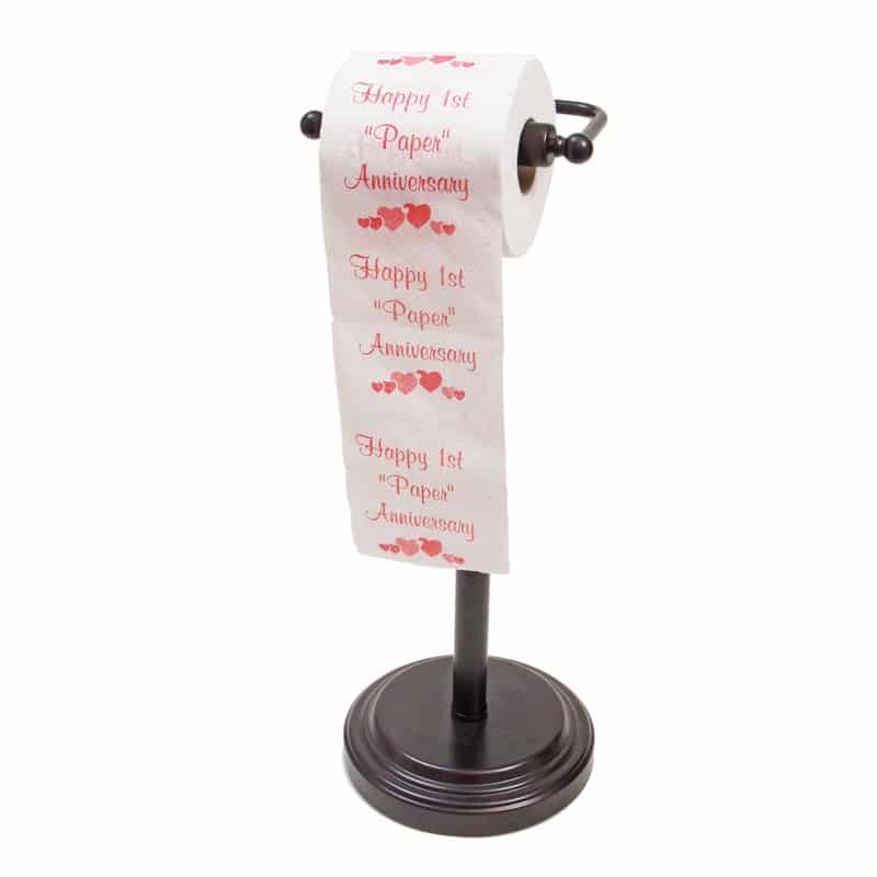That’s right, what is a funnier “paper” anniversary gift than a roll of “Happy 1st Paper Anniversary” toilet paper, switched out the night before to surprise your spouse the morning of your anniversary? Printed on the entire roll – 2 ply and can be used for the usual purpose, but the LAUGH is the gift.